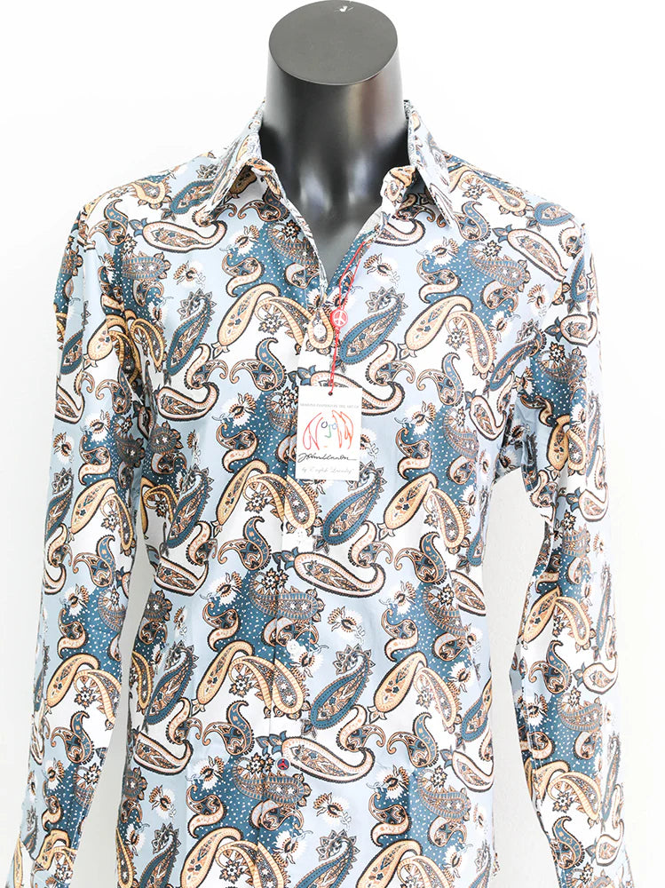 A refreshingly crispy paisley pattern long-sleeve shirt in shades of blue and offset with lemon. Perfect for desk-to-dinner occasions, pair with a charcoal or navy suit. Featuring our signature contrast trim, peace-sign buttons and John Lennon embroidered motif. Well-tailored and comfortable, this men's shirt features: 100% Cotton Classic Fit Printed.