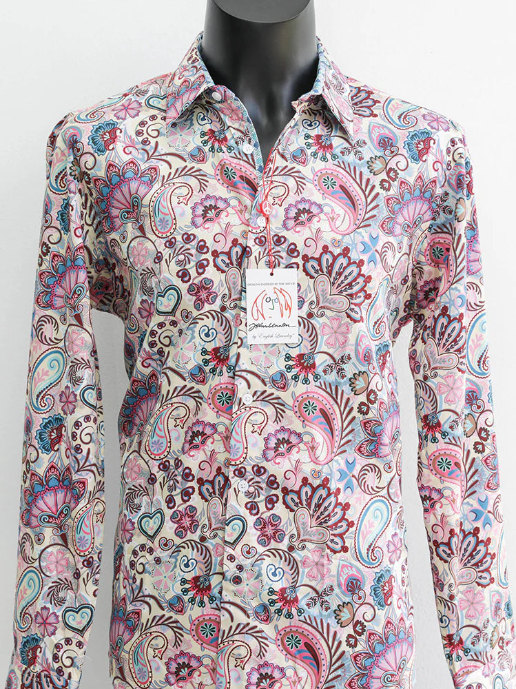 This long-sleeve ecru shirt brings classic bohemian style to life with its pink and blue paisley pattern. Featuring our signature contrast trim, a John Lennon embroidered motif, and peace-sign buttons. Well-tailored and comfortable, this men's shirt features: 100% Cotton Classic Fit Printed Cotton Soft Feel Sateen Printed Collar and Cuff. This long-sleeve ecru shirt brings classic bohemian style to life with its pink and blue paisley pattern. Featuring our signature contrast trim, a John Lennon embroidered motif, and peace-sign buttons.