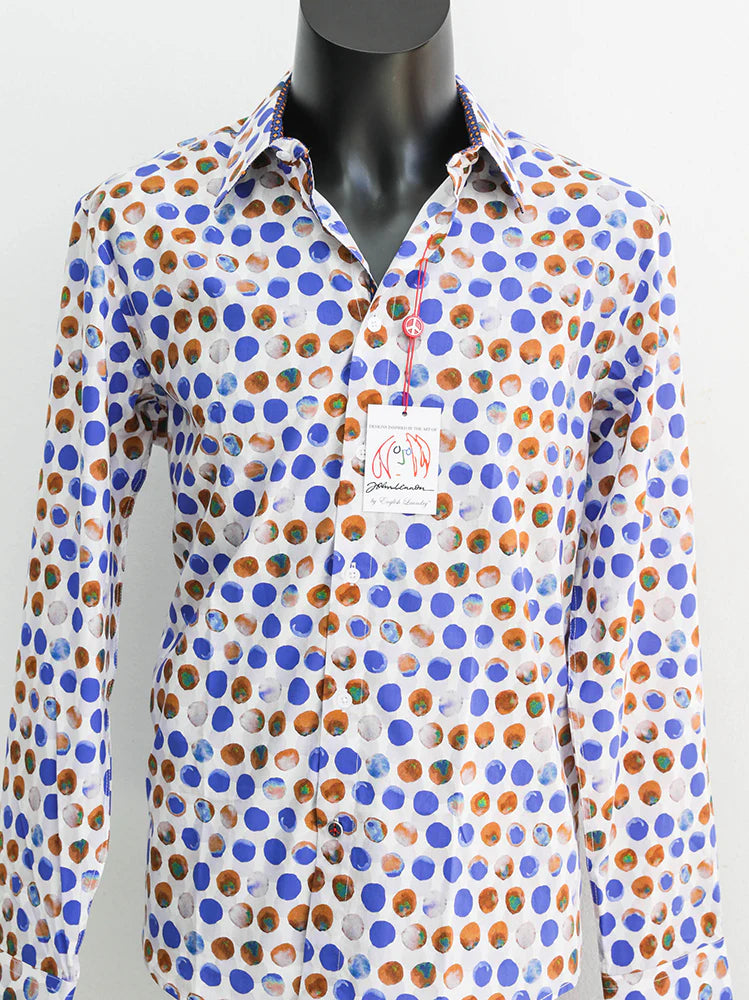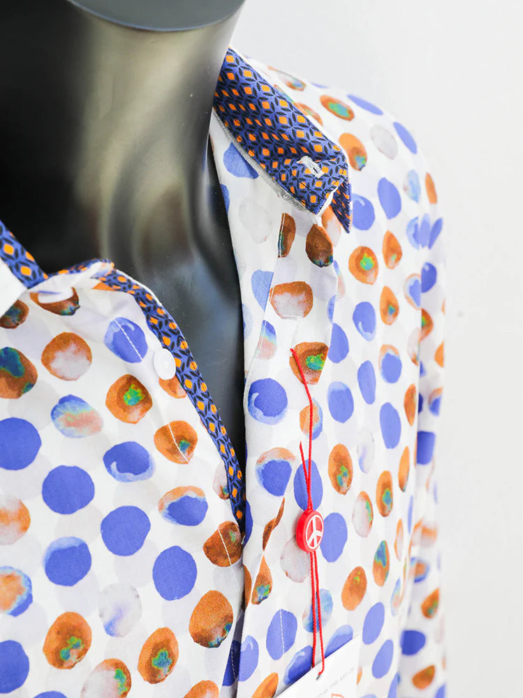 An artistic take on the classic polka dot shirt featuring painterly motifs in vibrant blue and orange. We've paired this with a matching geometric trim for a truly unique look. Guaranteed to raise a smile. Well-tailored and comfortable, this men's shirt features: 100% Cotton Classic Fit Printed Cotton Soft Feel Sateen.