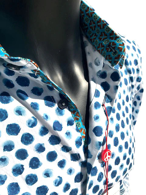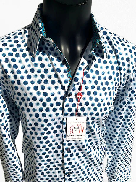 A painterly update on the classic polka dot shirt, beloved by the Beatles. Indigo polka dots adorn the crisp white cotton sateen, offset by a vibrant turquoise contrast trim. Well-tailored and comfortable, this men's shirt features: 100% Cotton Classic Fit Printed Cotton Soft Feel Sateen Printed Collar and Cuff About English Laundry's painterly update on the classic polka dot shirt, beloved by the Beatles. Indigo polka dots adorn the crisp white cotton sateen, offset by a vibrant turquoise contrast trim.